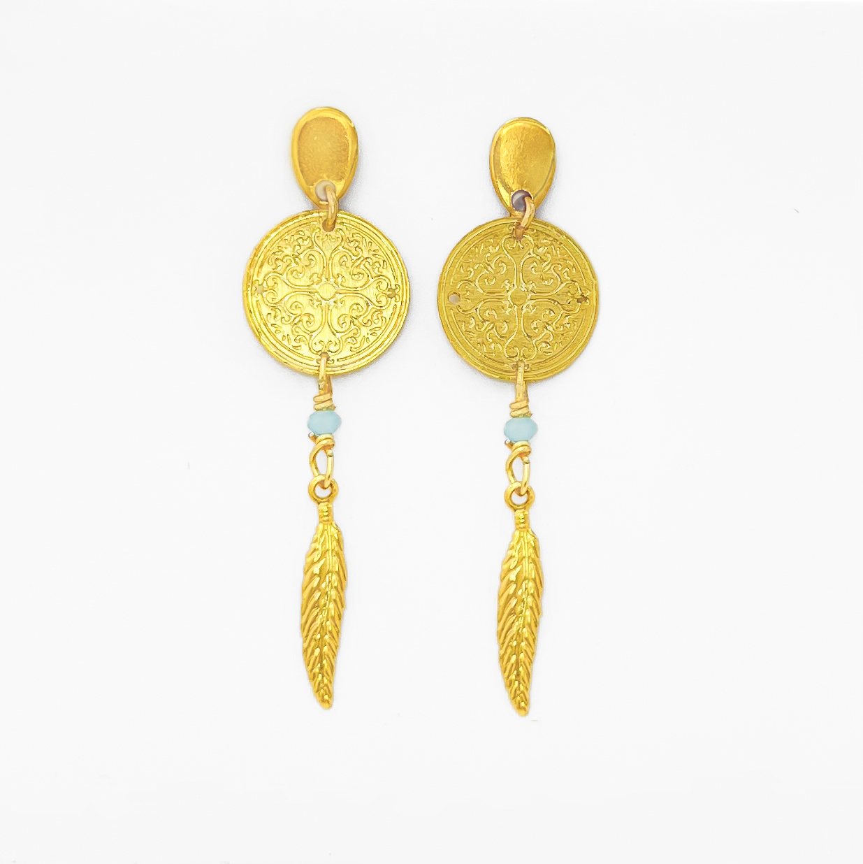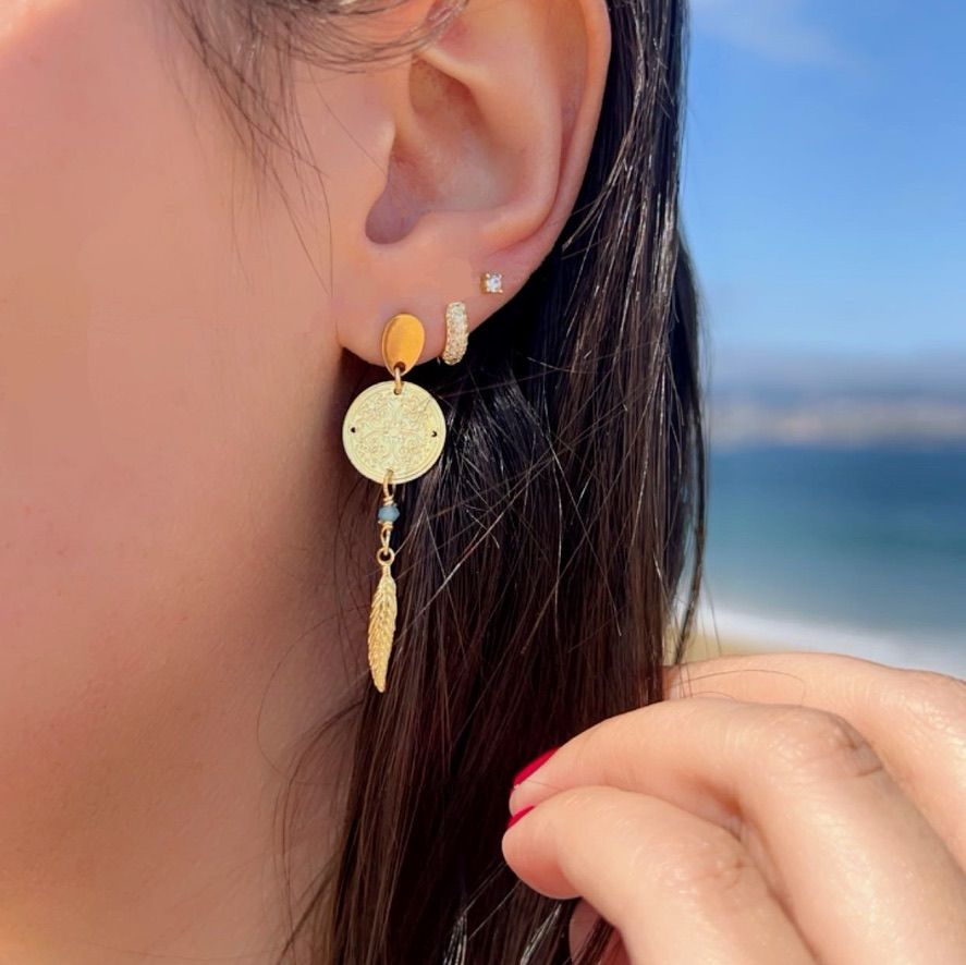 Aro bañado en oro 18K con una delicada pluma y una brillante aguamarina, perfecta para un estilo elegante y natural.