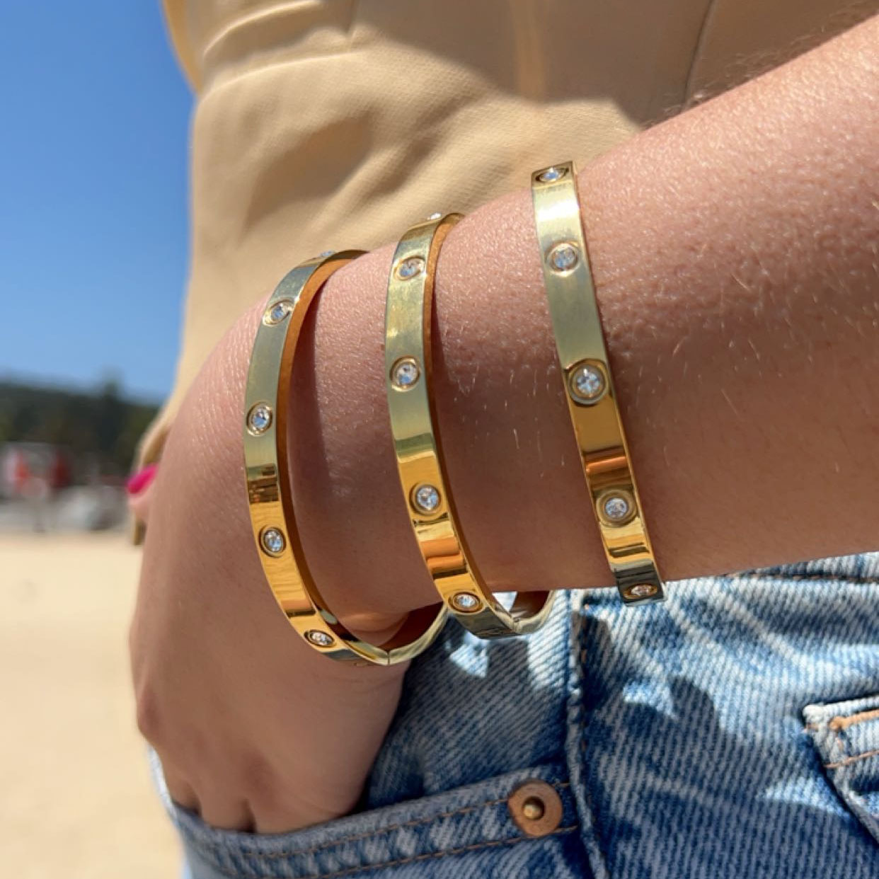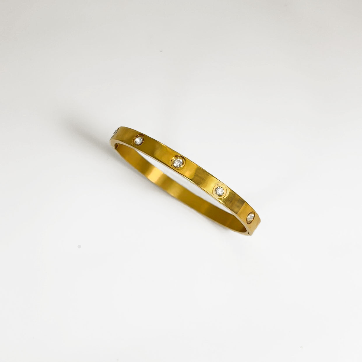 Brazalete bañado en oro engastado con circones, una joya radiante que captura la atención con su brillo sutil y refinado.