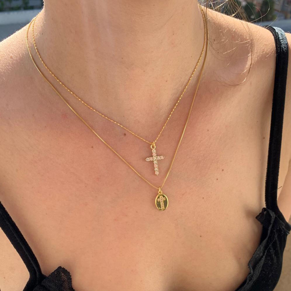 Collar bañado en oro con una hermosa cruz de circones, es una expresión de elegancia que ilumina cualquier ocasión.